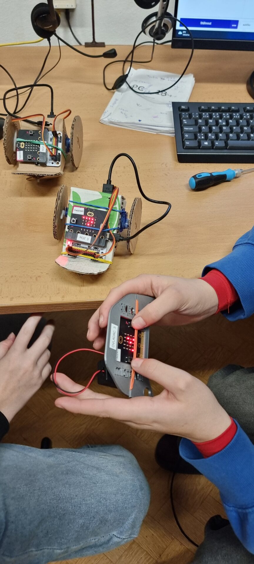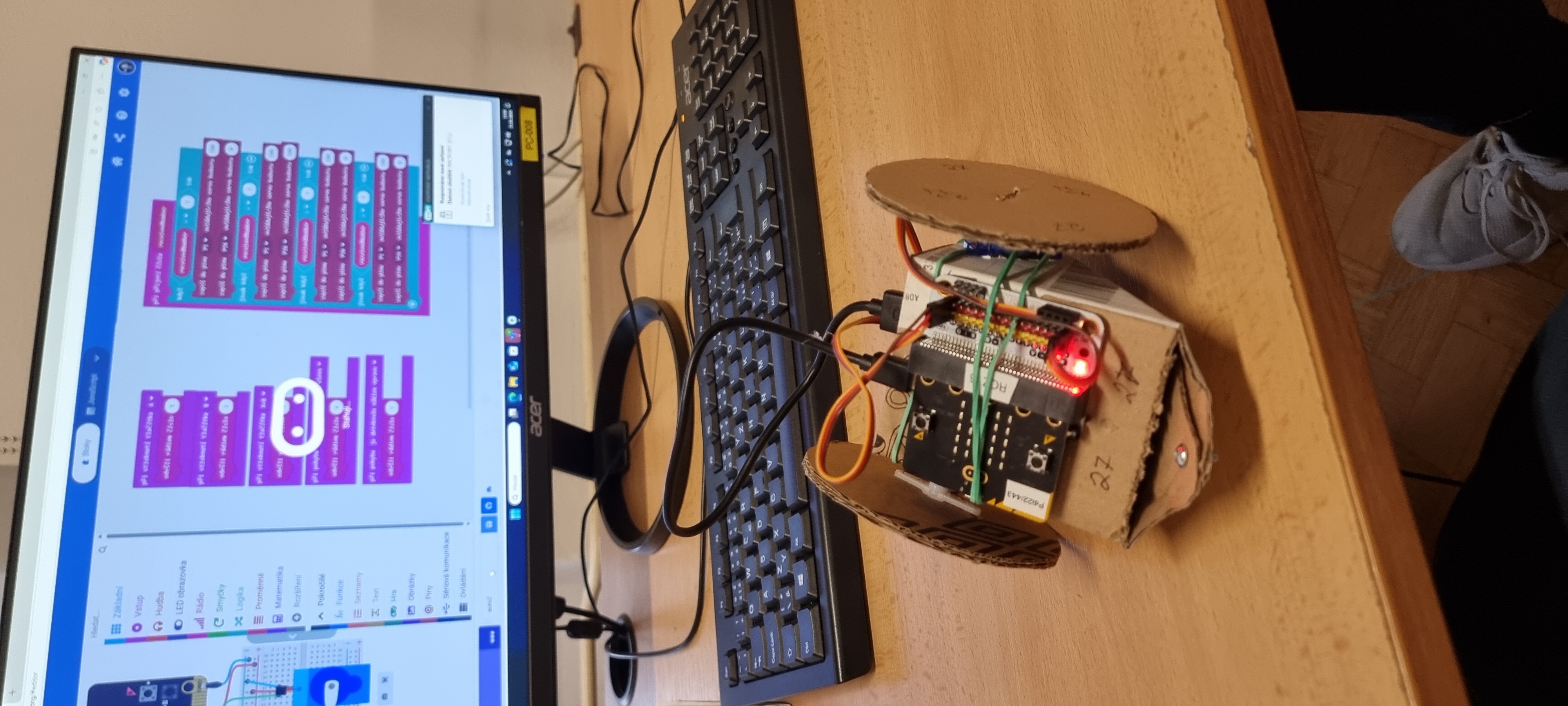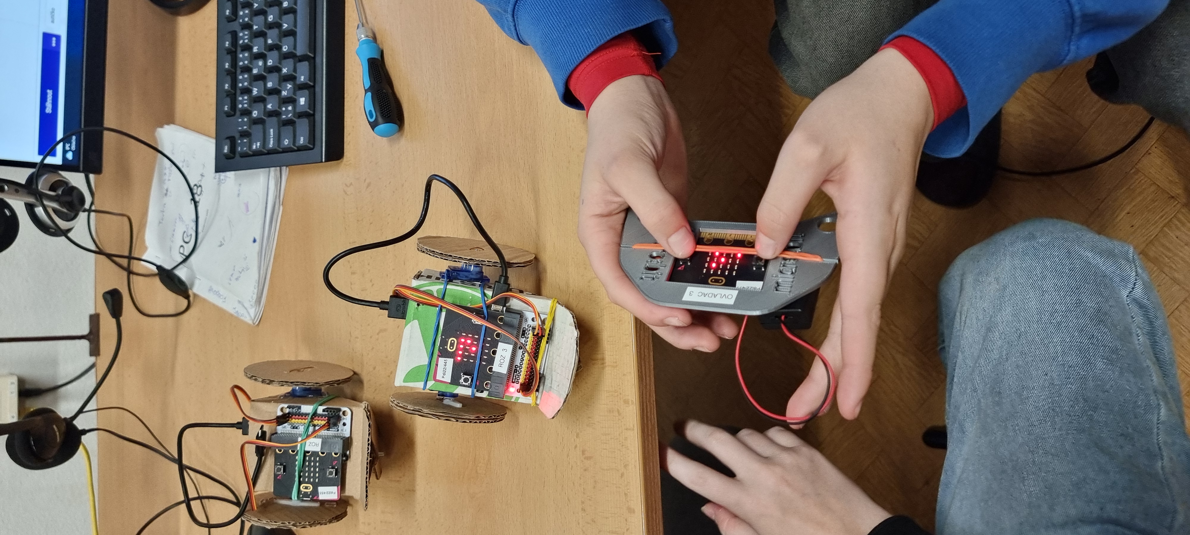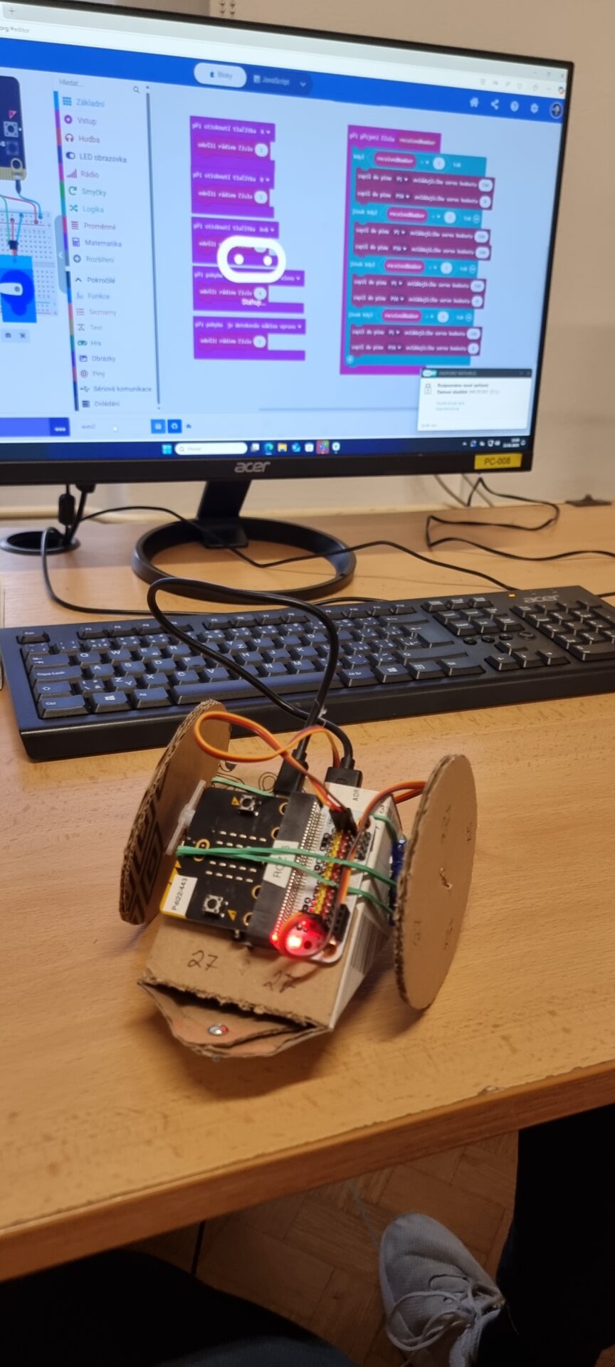3. Dálkově ovládané auto – Zde žáci vytvořili funkční model auta, které ovládali na dálku pomocí Bluetooth spojení mezi dvěma Micro: bity. Tento projekt je naučil základy bezdrátové komunikace, motorického řízení a praktické elektroniky.