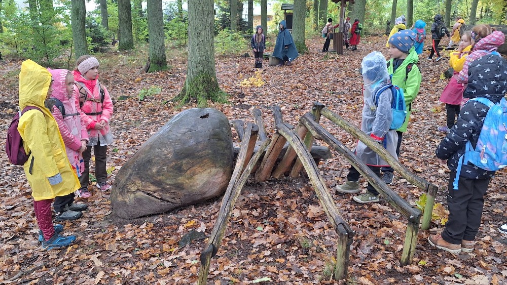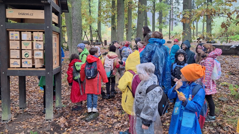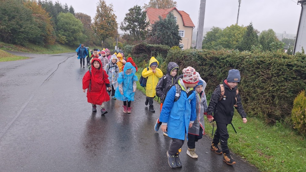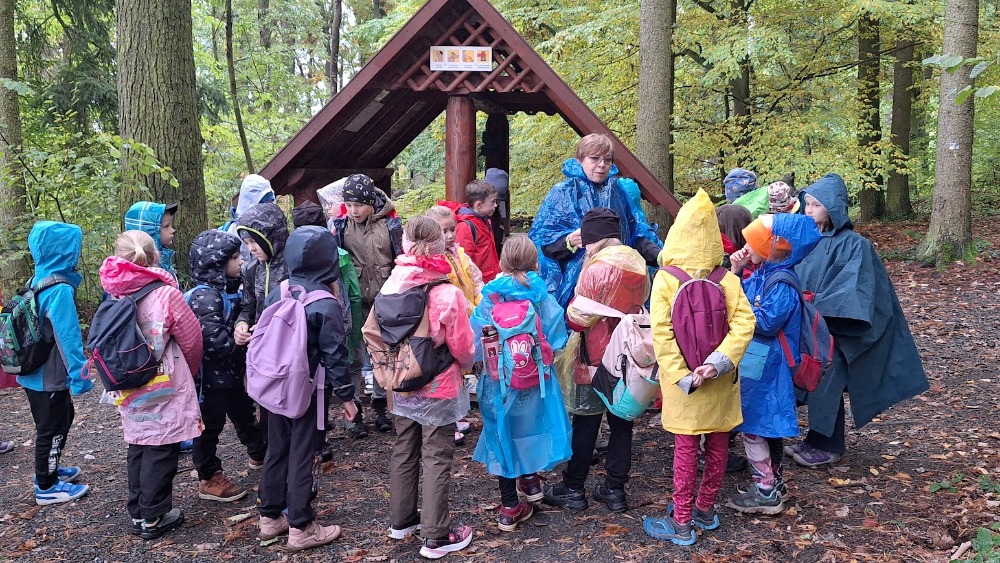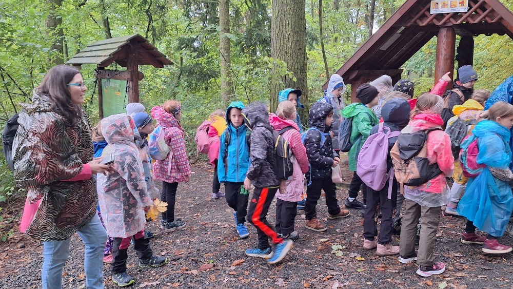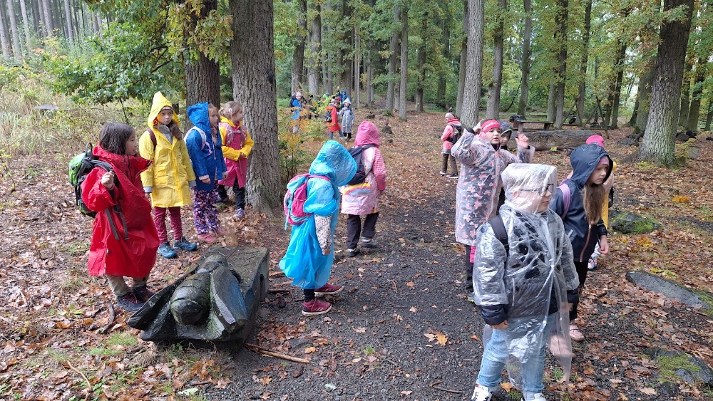Počasí nám moc nepřálo, ale brali jsme to s úsměvem na rtech. Nejprve nás čekala cesta vlakem, potom mírný pochod po silnici, a pak ještě zdolání dalšího převýšení a už jsme byli na místě. V zoologické zahradě se nachází dřevěné a kovové sochy zvířat, našli jsme i hmyzí stezku, zasoutěžili si v hodu kruhy na cíl a nasvačili se pod pavoučí sítí.